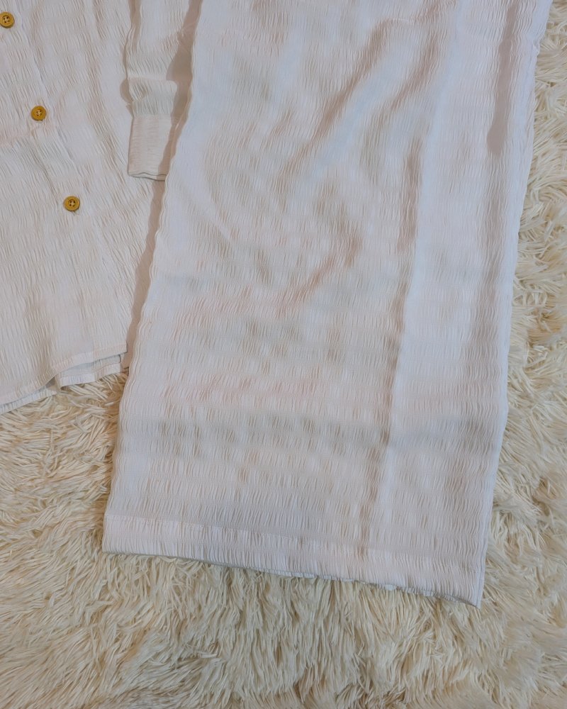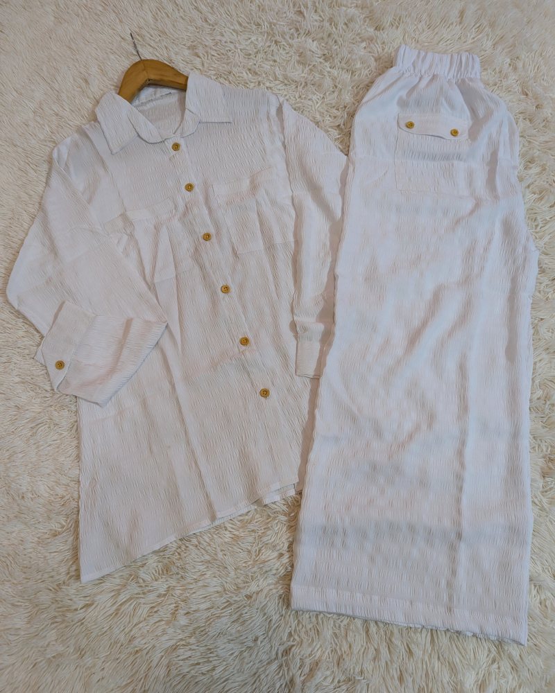 Product Details: Western Crush Co-ord Set, With luxury fine quality material, one side trouser pocket, front open style top, its very suitable for fours seasons.Fabric Info: Crush Imported.