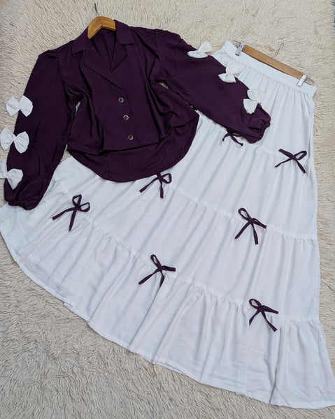 Stylogue Signature Bow Ensemble Elevate your wardrobe with this elegant two-piece outfit featuring a deep purple puff-sleeve blouse adorned with delicate white bows and a matching white tiered skirt embellished with purple accents. Crafted from...