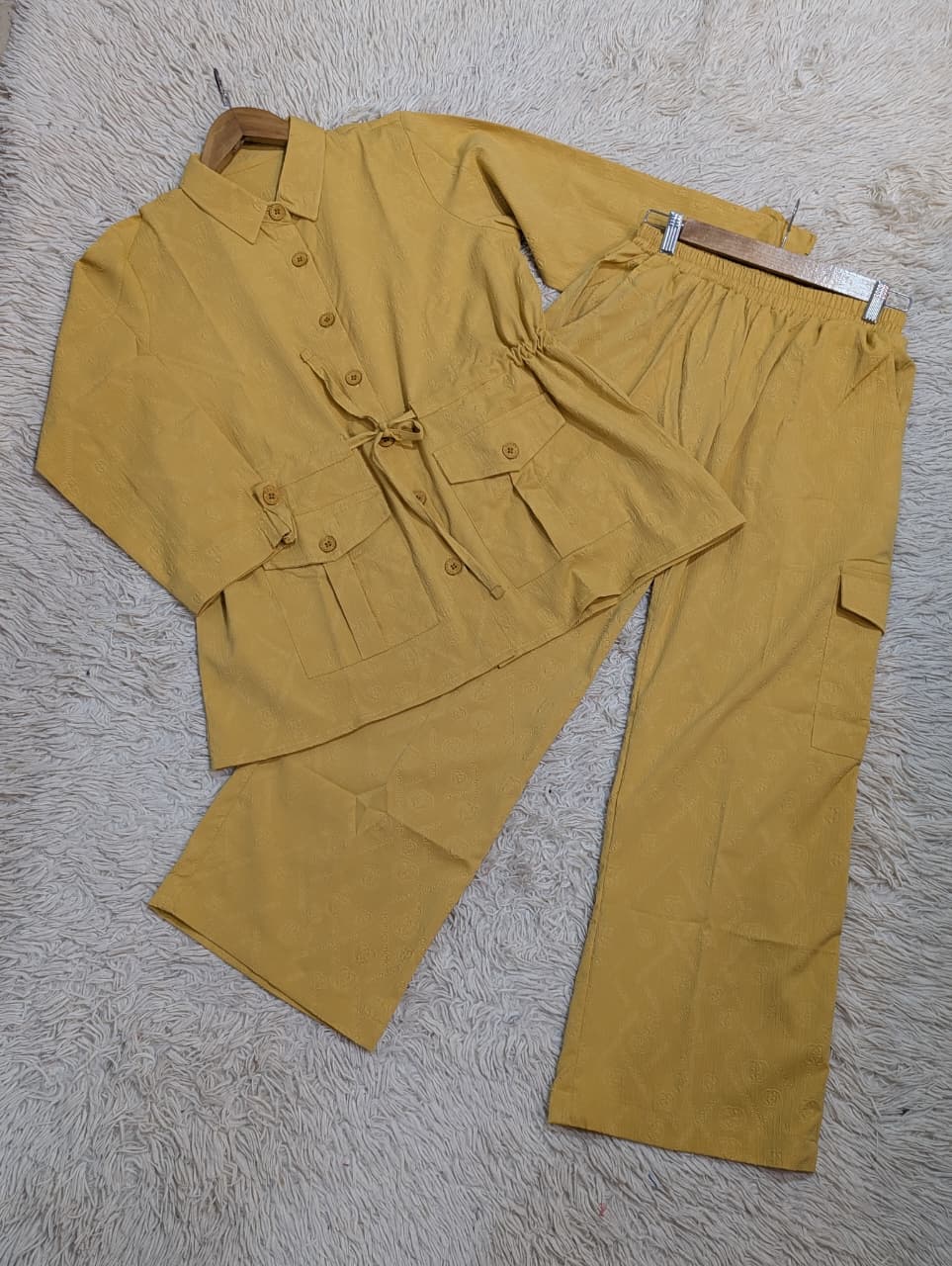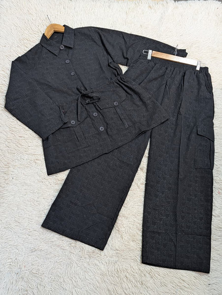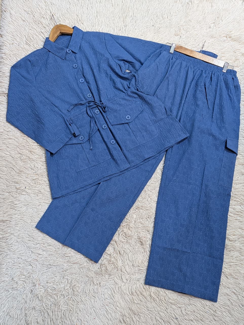 Embossed 2Pc Co-Ord Embossed 2Pc Co-Ord: With 3apc Fabric Embossed, Fine Quality, & Stitching also outclassed, Size Shirt 32-33, Trouser Cargo 37-38, Chest 20-21.