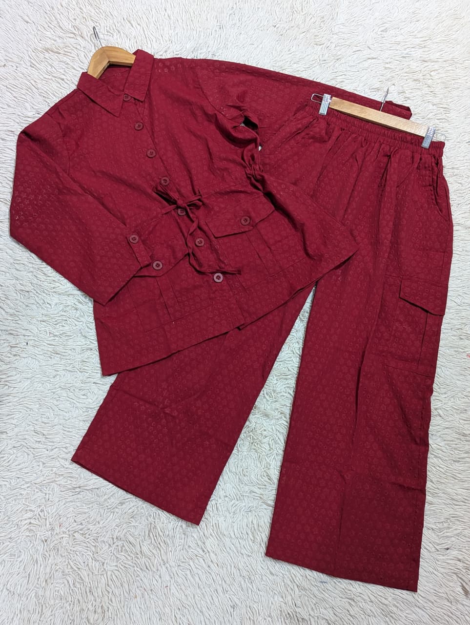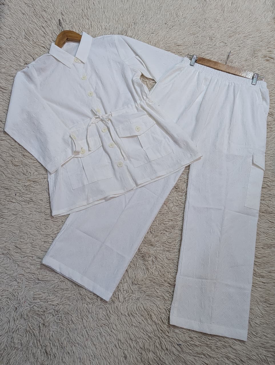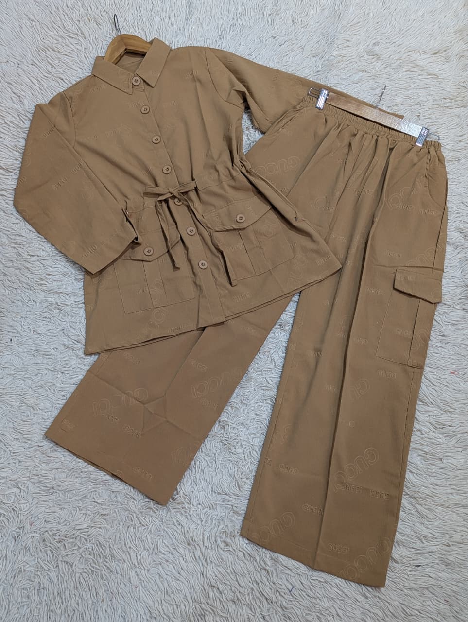 Embossed 2Pc Co-Ord Embossed 2Pc Co-Ord: With 3apc Fabric Embossed, Fine Quality, & Stitching also outclassed, Size Shirt 32-33, Trouser Cargo 37-38, Chest 20-21.